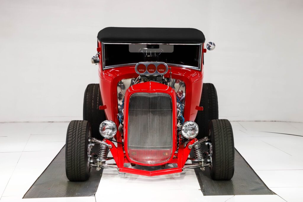 Up front it has a ’32 grill. The body is metal, no rust or damage. The doors open by remote, they shut nice and solid. It’s painted a gloss red. Smoked glass, the windshield still opens. The roof is finished in a rich padded black canvas. It’s rolling on 15 inch Torque Thrust wheels, much wider in back with a fat set of BFG tires. INTERIOR: First of all, I’m 6 foot tall and fit in the car rather comfortably. I’m looking at a custom made – painted red dash with a billet instrument bezel and a matched set of Stewart Warner gauges including a tachometer. There’s also a Panasonic CD stereo and a polished wood rim wheel. There are switches for the power windows, door releases and power trunk. It is completely upholstered a comfortable 2 tone gray cloth. Down on the floor is sound deadener, black carpet and billet pedals. ENGINE COMPARTMENT: Gm crate 502 big block recently installed, receipt is included. It features forged steel crank and rods, forged aluminum pistons, roller cam. Up on top is a giant Weiand blower with 2 dual feed Holley 4 barrel carbs and a polished air cleaner scoop. Premium fuel lines and fittings and an electric fuel pump. The firewall has a polished insert. Brackets, pulleys, valve covers are polished. Chrome alternator and water pump. An aluminum water pump and radiator with an electric fan keeps it cool. TRUNK: It’s a power operated trunk lid. Inside is carpeted. The battery is located in the trunk in a battery box. The fuel filler is too. UNDERSIDE: Boxed and smooth frame with tubular supports painted red. Clean metal floor painted gloss red. Upfront is a chrome independent suspension. Polished tubular control arms, swaybar and coilover gas adjustable shocks. Rack & pinion steering. In back is a very cool set up. Fully polished independent Jaguar suspension. It has 4 coil over adjustable gas shocks and tubular control arms. Power disc brakes in front, inboard disc brakes in back with billet calipers. Dual exhaust with glass pack mufflers and stainless tips. Bottom of the motor is clean, has a high torque starter and chrome flywheel cover. Turbo 400 automatic with a finned pan and remote oil cooler. Custom made aluminum drive shaft leads to the Jag rear end which has a finned cover. This is a true hot rod! Way more motor than you need, fat rear tires and a chopped top. It’s actually a comfortable driver considering what it is. The quality of work appears to be very good. Ready for show and go go go!