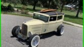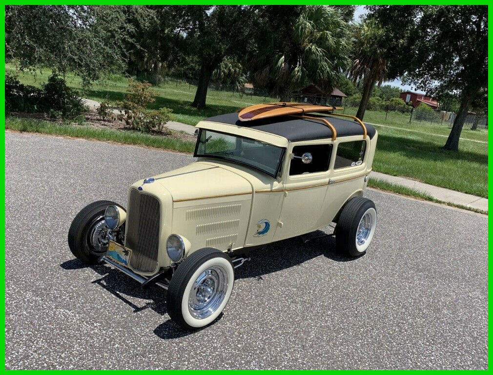 1931 Ford Tudor Steel Body Street Rod For Sale. 283 cubic inch V8 engine, electric fan, steel stamped valve covers and oil bath style air cleaner with custom paint, 5 speed manual transmission with hydraulic clutch, chrome plated front suspension, front disc brakes with finned covers, 15" chrome wheels with white wall tires, 4 bar rear suspension with adjustable coil over rear shocks, chrome plated 15" steel wheels with white wall tires, tan paint with wood and other…