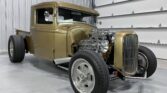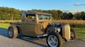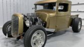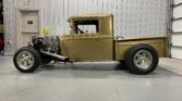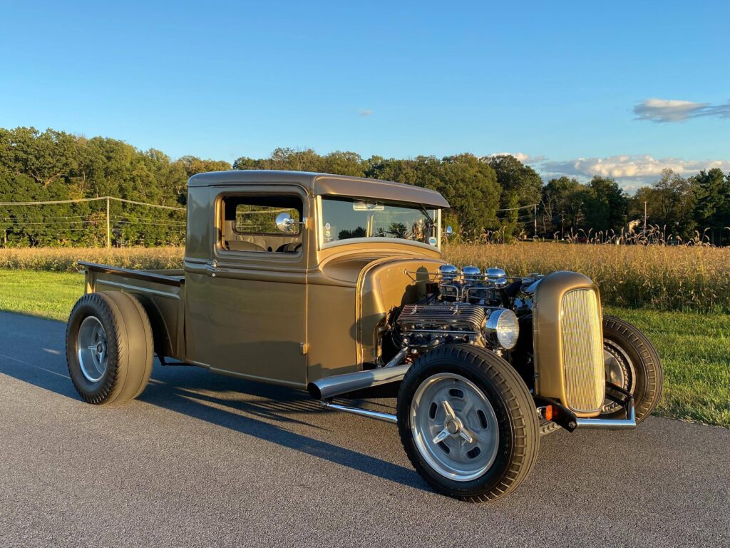 This contemporary build of a classic early Sixties-style 1934 Ford pickup hot rod is loaded with period-correct elements, according to the selling dealer, including the chopped cab, shortened bed, 1957 Oldsmobile tri-power engine, Deuce grille, Halibrand-style mags, and over-the-frame headers. The interior is compact, but the builder added 6 inches to the back of the cab for extra comfort, and the handsome paint is a 1955 Chevy hue.