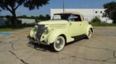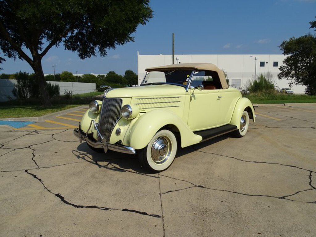 Deluxe Roadsters Produced in 1936 * 221 CI Flathead V-8 Engine * Stromberg 97 Carburetor * 3-Speed Manual Transmission * Finished in Pale Yellow with Brown Leather Interior * Banjo Steering Wheel * Rear-Mounted Spare in Steel Case * Draft Deflectors * Greyhound Mascot * Bumper Guards * Chrome Spyder Hubcaps * Wide Whitewall Tires