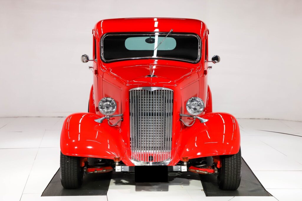 Genuine 1936 GMC T-14 pickup with steel body and bed, finished in high-gloss red. Features a custom grille, chrome trim, and Cragar wheels. Powered by a 350 V8 with tri-power carbs, MSD ignition, and Turbo 350 automatic. Built on a custom chassis with independent suspension, Jaguar rear, and 4-wheel disc brakes. Interior includes gray tweed upholstery, Auto Meter gauges, A/C, heat, and Alpine audio. A fully restored classic with modern upgrades and show-quality detail.