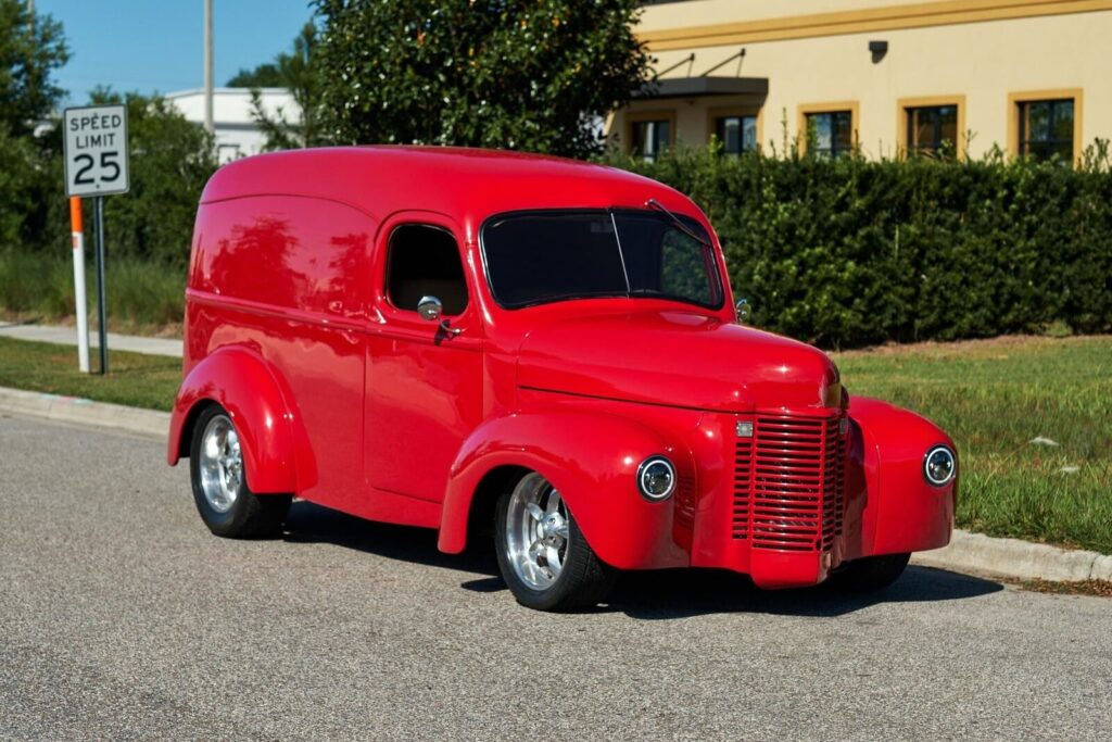 1941 International Harvester 1200 S Panel Wagon Very rare 41 international panel wagon, professionally built fat fender resto mod. Single rear door option. 4 wheel drilled slotted power disc brakes. Rear leaf spring suspension. 3-inch drop Mustang ll type front suspension. LED Headlights. Painted original front V grill. Superbly detailed engine compartment, firewall & inner fender wells. Split front windshield. Stereo mounted in overhead console. Head turning stunning custom build. Amazing Red two stage base coat / clear…