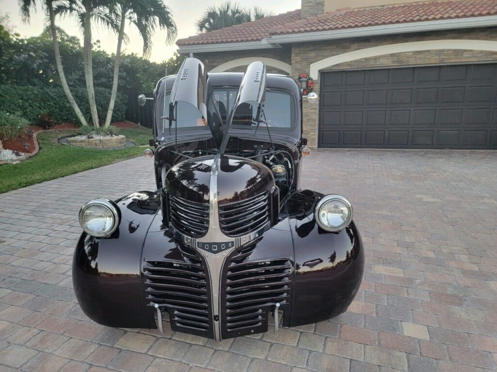 This 1947 Dodge Pickup is an original. The vehicle runs great and is mainly used for car shows.Many new parts on the build. most recent under 200 miles. Completely new wire harness, coldmaster a/c unit, aluminum radiator fans and hoses, chromed alternator with pullys and cvf laser cut aluminum brackets. Hydro boost power brakes, power steering, Holly sniper EFI with in tank electric fuel pump 6psi, 340lph. Holly hyper spark billet distributor. Holly sniper spark EFI ignition box. New MSD plug wires. Fitted to fresh 302 Ford 5.0, with 4300 miles. Drives smoothly down the road on 18″ BF Goodrich radials 235/50 zr18 97w g-force comp 2 A/S. Mounted on 18″ Coys chrome front and 18′ chrome rear Riddler wheels. You can drive this truck anywhere with no worries on getting there, in comfort and style with ice cold A/C and am/fm cd player. Automatic floor shift, cruise control.