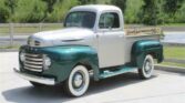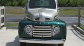 This 1949 F-1 Pickup is the result of an extreme body-off restoration where no expense was spared and strict attention was paid to every detail in the restoration process. With all-steel body and fenders and finished in a one-of-a-kind color combination of Champagne and Emerald Green, this truck wins the attention of all who see it. The restoration included replacement of all glass, rubber gaskets, period-correct tires and oak box bed. All chrome and stainless steel was replaced and the truck was upgraded to a 12-volt electrical system. The highly detailed engine compartment demonstrates the attention to detail and the 239 cubic inch flathead V8 runs like a watch. On the interior, brown vinyl seating and flawless champagne dash provide a further example of the high caliber of this restoration.