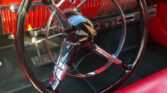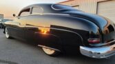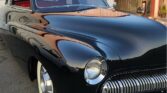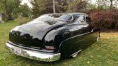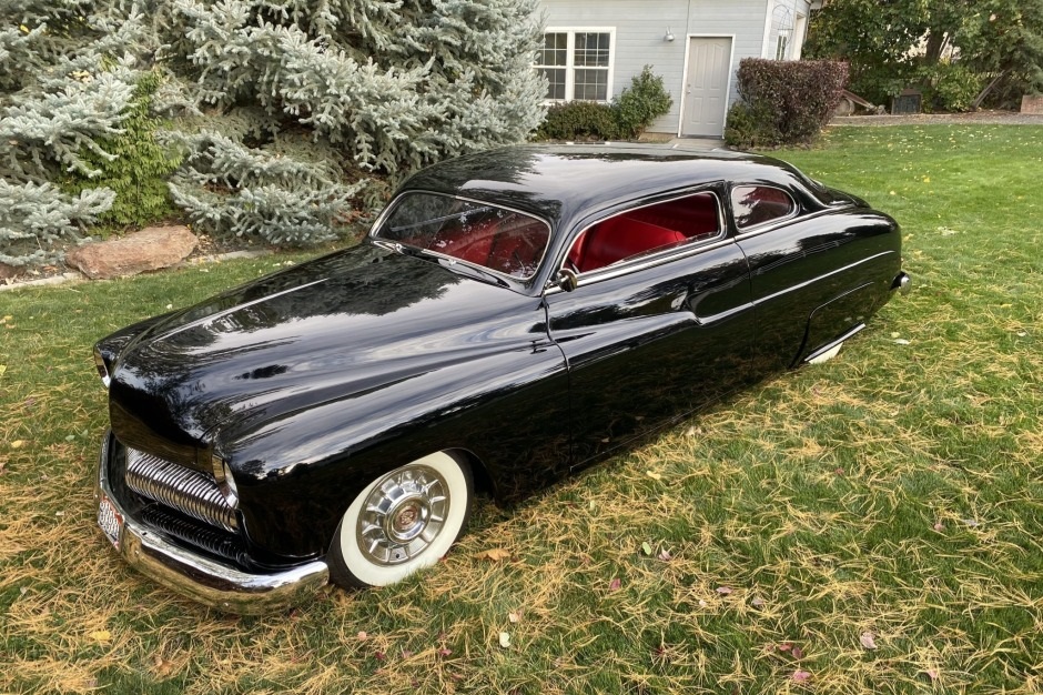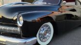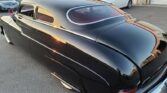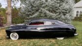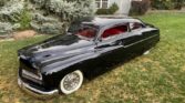 The car is finished in black over red vinyl upholstery and is powered a Chevrolet 350ci V8 mated to a TH350 three-speed automatic transmission. Equipment includes a welded-in Nova front clip, frenched headlights and taillights, a chopped roof, and shaved wipers and door handles as well as steel wheels with Cadillac covers, power-assisted front disc brakes, an Edelbrock carburetor and intake manifold, a digital dashboard, and aftermarket air conditioning.