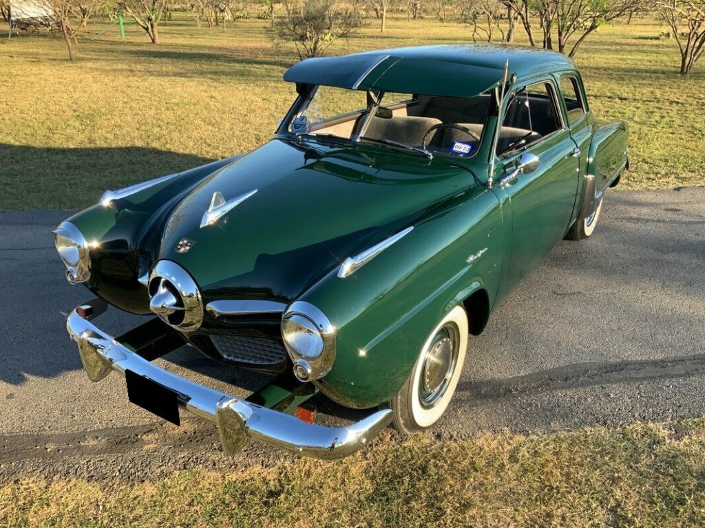 Lift the uniquely-shaped hood and you’ll see one of the coolest 6-cylinder engines around. This 170 ci jewel has been fortified with an aluminum Studebaker head, an aluminum Offenhauser dual intake with twin Carter carburetors, and headers feeding a dual exhaust system with H-pipe. A smooth 3-speed manual transmission with overdrive (and functioning Hill Holder!) allows relaxed highway cruising while enjoying the sweet music of the split exhaust.This is a beautiful example of a cool car that can be driven anywhere.