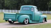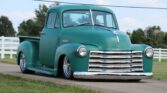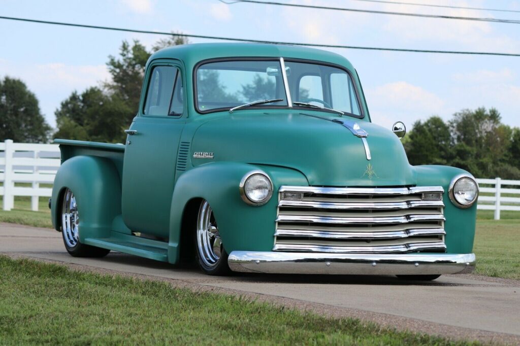 This one-of-a-kind 1951 Chevy 5-window cab features a 383 cubic-inch stroker V8 and a 700R4 overdrive transmission. Styled with matte green paint, a “Green Hornet” graphic, and American Racing alloys, it offers a custom look with modern performance. The interior boasts premium diamond-pattern leather, R134a air conditioning, and Dolphin gauges. With power disc brakes and independent front suspension, this 3100 is a reliable, show-stopping cruiser.