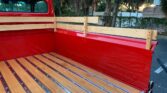 Other modifications include dual exhaust, 15” painted steel wheels with radial tires, and a vibrant red exterior with tan trim. The smooth running boards add to the truck’s sleek look, and the oak bed floor with polished stainless steel strips is both beautiful and durable. Wood bed rails complete the rustic charm of the bed.