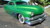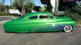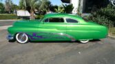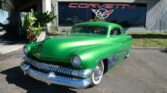 It was started with a rust free stock totally restored 1951 Mercury. From there it was totally disassembled and built from scratch. No attention to detail was overlooked including the chrome window trim, molded in drip rail above the side windows, recessed rear bumper, and if you notice how the rear window transitions into the trunk surround rather than jst ending abruptly like most chopped coupes. It has been chopped, is House of Colors green with pearl, full leather interior including door panels, suede headliner, and wool carpets. It has a green lighted Dakota Dash, Customautosound hidden audio, Vintage air conditioning, rear air bags, shaved handles, 302 engine, C4 transmission, and Ford 9″ rear end. front power disc brakes, custom made steering wheel and dash knobs, plus much, much more.