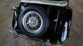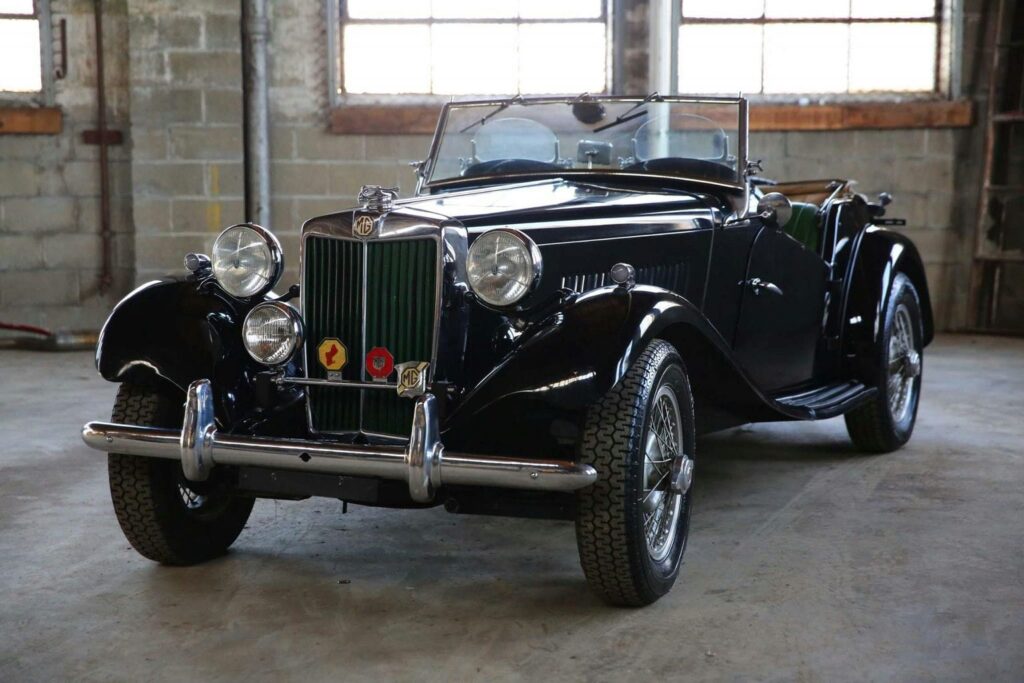 This 1953 MG TD is finished in black over a green vinyl interior and is powered by a 1,250cc inline-four paired with a four-speed manual transmission. The car features a tan soft top, green-accented vertical grille slats, and chrome bumpers with overriders. Additional equipment includes a folding windshield with powered windshield wipers, a wood-rimmed steering wheel, a front fog lamp, dash-mounted Brooklands-style windscreens, and 15″ Borrani wire wheels with two-eared knock-offs.