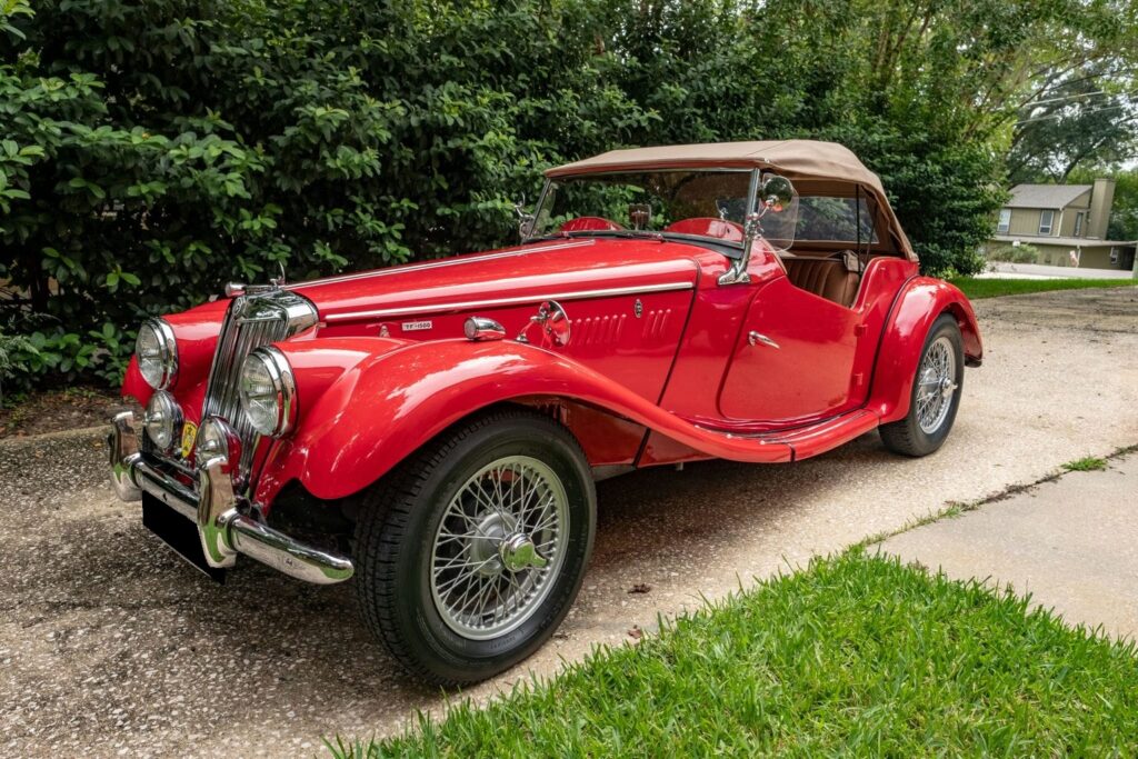 Finished in striking red with a re-trimmed tan leather interior, this TF 1500 also received a new fuel tank and replacement tan soft top. Additional highlights include 15″ wire wheels, chrome grille and bumpers, windshield and fender-mounted mirrors, rear-hinged doors, and tasteful period-style upgrades.