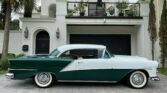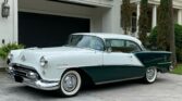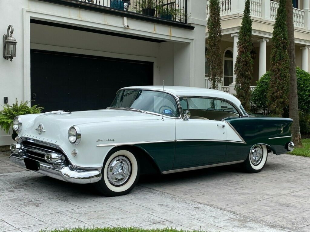 This 1954 Oldsmobile Ninety-Eight 2-door Holiday Coupe features a 324ci V8 with Holley 4-barrel carburetor and Hydra-Matic 4-speed automatic. Equipped with factory power steering, brakes, front seat, rear A/C, and power windows. Polar White and Green exterior with 15″ factory wheels, Coker whitewall tires, dual exhaust, and super deluxe AM radio. Interior and chrome in excellent condition. Ideal as a daily driver, weekend cruiser, or show car.