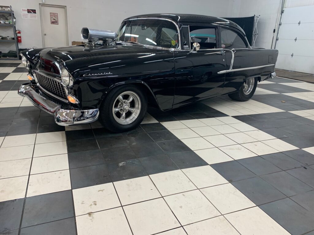 1955 Chevrolet 210 pro street. Big block 454 .60 over to 468_ 8/71 Blower with Twin 4 Barrel carbs. putting out around 750 HP. Built 400 turbo transmission with a 3000 stall converter and shift kit_ Hurst Quater shifter with reverse lock out_ Ford 9″ rear end with 4:10 gears_ Power Steering_ Power Brakes- 4 wheel disc and Vintage Air_ All new interior with Dakota digital gauges as well_ this car is set up for street or track whatever you want