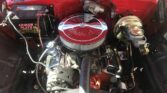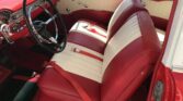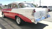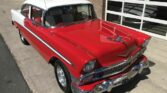 1956 Chevy Bel Air 2 door has had a frame on restoration and comes equipped with a 400ci V8, automatic transmission rebuild, mild cam, new radiator and fan, new master cylinder, new power disc front brakes, new rear drum brakes, new power steering, new B&M floor shifter, replaced – gauge cluster, Sun Pro gauges, bench seat with seatbelts, custom red and white interior, newer vinyl upholstery and carpet, rebuilt front Suspension, 15 inch chrome American racing wheels with Cooper cobra GT tires P235–60R15, dual Flowmaster exhaust new windshield traction bars and detailed trunk.