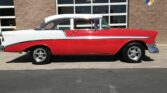 1956 Chevy Bel Air 2 door has had a frame on restoration and comes equipped with a 400ci V8, automatic transmission rebuild, mild cam, new radiator and fan, new master cylinder, new power disc front brakes, new rear drum brakes, new power steering, new B&M floor shifter, replaced – gauge cluster, Sun Pro gauges, bench seat with seatbelts, custom red and white interior, newer vinyl upholstery and carpet, rebuilt front Suspension, 15 inch chrome American racing wheels with…
