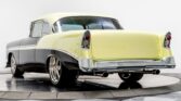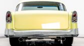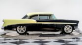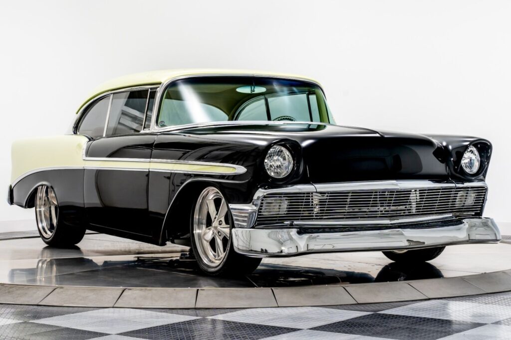 We have just added to our extensive exotic car inventory a beautiful 1956 Chevrolet Bel Air in Black and Pearl Light Green over Cream leather interior. This beautiful Bel Air is a stunning, show winning hot rod and one of the nicest Tri-5 s we ve ever seen. The body is exceptionally straight with perfect black and light green paint. The gold pearl gives the green an iridescent quality that turns the paint from a near gold to antifreeze green depending on the light–its absolutely mesmerizing. The emblems and door handles have been shaved but the distinctive 56 body trim remains, and the bumpers were shaved before being expertly replated. 18 inch front and 20 inch rear polished wheels are paired with polished Wilwood brakes. The stance is absolutely killer thanks to the adjustable coilovers on the Art Morrison GT Sport chassis with chromed front suspension components. Looking further underneath you ll find a Ford 9″ rear axle, a polished stainless steel fuel tank, polished stainless steel exhaust, chromed coilover springs and more. Pop the hood and you ll see a shaved and smoothed engine compartment stuffed with a gleaming fuel injected 502ci RamJet V8 with a chromed intake and cool finned valve covers. There s a billet accessory drive up front and ceramic coated headers on the sides. The brake master cylinder was even moved inside the car to make sure your attention was firmly glued to the massive mill in the center. Inside, the custom interior has unique small touches from top to bottom. Start with the full length center console with Vintage Air controls, power window switches and a sliding compartment door hiding the stereo, ignition switch and controls for the power lifting trunk. You ll also notice a chromed Hurst shifter with chrome ball on top–this car has a real deal TREMEC TKO 600 5 speed manual transmission under it! Soft cream leather covers just about every surface inside from custom door panel to custom door panel. This is a super clean, unique interior befitting of a car of this caliber. This is an amazing car that you ll want to stare at for hours.