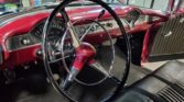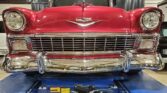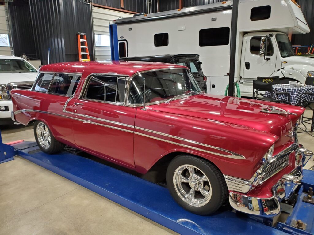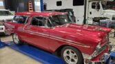 This 1956 Chevrolet Bel Air Nomad is finished in metallic red over black upholstery and powered by a 265ci V8 paired with a two-speed Powerglide automatic transmission. Equipment includes a two-piece tailgate, tinted windows, double-staggered Torq Thrust II wheels, a dual exhaust system, and a retro-style cassette stereo.