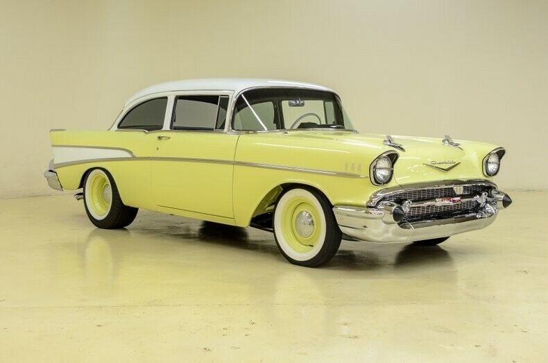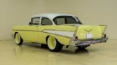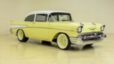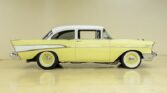 When this Chevy rolled off the assembly line in 1957, it was one of three basic models. The 150 was the standard bearer, the 210 had some cosmetic upgrades and the BelAir was the top-of-the-line. Most folks restore BelAirs. However, the 210 has nice simple lines and makes a clean street rod. This 57 210 post received a total resto-rod restoration in 2016 with dozens of mechanical enhancements. (An extensive notebook of receipts and photos is available.) Horsepower (600+) comes from a rebuilt 454ci big block. It is fitted with aluminum heads, Edelbrock single-plane intake, Holley dual-feed carb and Moroso HEI ignition. Cooling is provided by an aluminum radiator and exhaust escapes through a set of stainless tube headers mated to 3″ custom pipes. The transmission is an EMCO T-56 6-speed manual and the differential is a posi-traction Dana unit with 3.55:1 gearing. Brakes are 4-wheel disc with a Billet master cylinder set-up. Custom rally wheels (16 x3.5 front 16 x10 rear) mount wide-white Firestone tires – Cheater slicks in the rear. This Bowtie looks as good as it runs. The Chevrolet Yellow (1957) finish with Artic White trim give the classic Chevy a period-correct look. Every interior component is brand new or restored including seat upholstery am, dash, door cards, carpeting, headliner and weather-stripping. A Vintage Glass smoked glass package was installed with all new trim. This handsome Chevy 210 Sedan will soon make a new owner very proud.