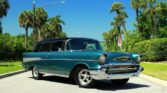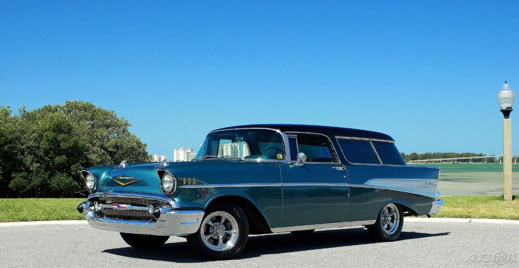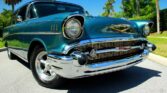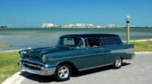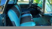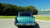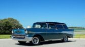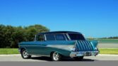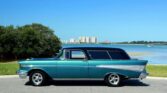 This particular Nomad Wagon is finished in a Classic 50’s two tone paint scheme. A dark teal exterior with a contrasting black painted roof. The cloth bench seat interior is color coordinated to the exterior also in black and teal. Powered by a 283 Cu In V8 with aluminum intake, dual feed 4 barrel carb, Griffin aluminum radiator and twin electric fans all sitting in a detailed engine bay. It’s equipped with power steering, Wilwood power front disc brakes and Vintage air conditioning system. Tubular control arms are a noticeable upgrade to the front suspension assisting in giving this Wagon a smooth ride. The interior remains basically stock with the addition of a set of auxiliary gauges and an AM/FM radio. The car rolls on a set of American Racing alloy wheels with Michelin 205/70R 15’s.
