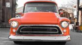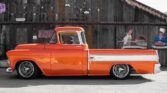 This 1957 Chevrolet Cameo pickup has been refinished in orange over a tan interior with black accents and is powered by a 5.7-liter LS1 V8 paired with a 4L60E four-speed automatic transmission. The truck underwent a refurbishment prior to the seller’s acquisition in 2019, and modifications performed in 2021 are said to have included installation of a custom four-link Air Lift Performance suspension, a Holley Sniper EFI intake manifold and throttle body, a custom-built wood-lined raised bed floor, Raceline Bandit 18″ wheels, an aluminum fuel tank, Fat Man Fabrications control arms, Air Lift airbag suspension with Bluetooth control, Classic Instrument gauges, and a Bluetooth audio system. Additional features include chrome bumpers and trim, a curved rear window, air conditioning, a heater, power windows, and a dual exhaust system. This modified Cameo.