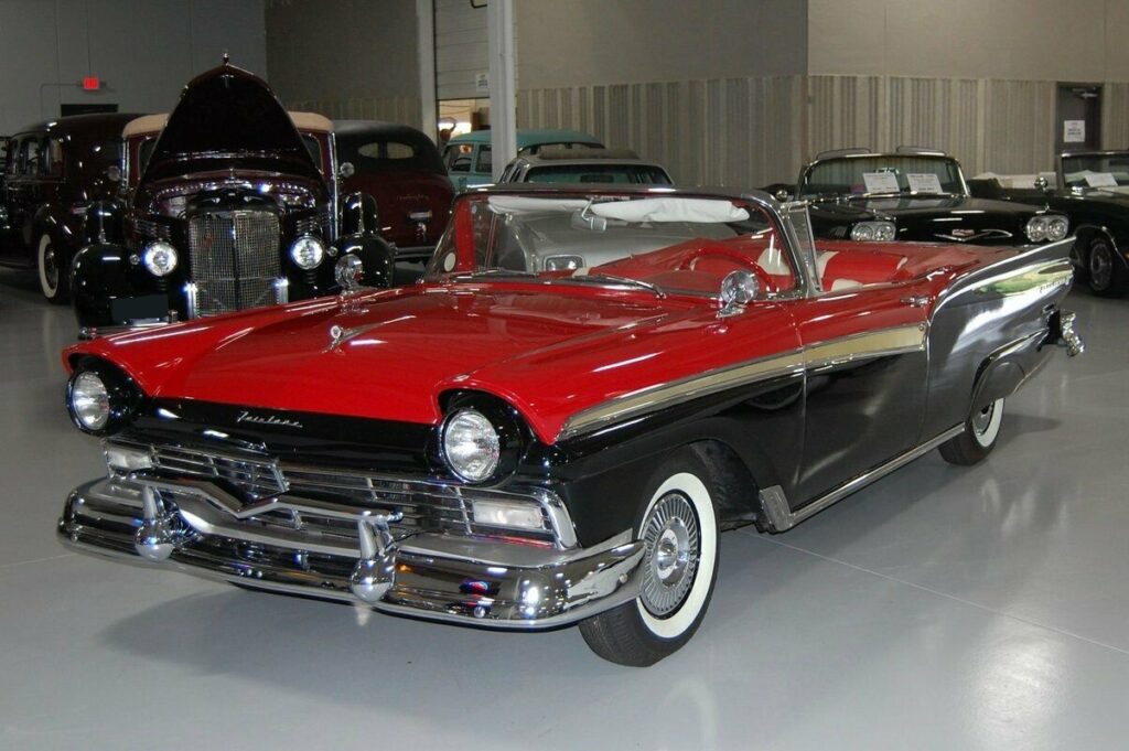 This 1957 Ford Fairlane 500 Sunliner is made for cruising. Powered with a 312 V8 engine and a 3 Speed Manual Transmission you'll enjoy a smooth ride with the comfort of power steering as well. The odometer reads 18,367 miles on this Fairlane. The two-tone Flame Red and Raven Black exterior paint as well as the gold trim is in beautiful condition. Wide white wall tires add to the 50s flare of this '57 Ford Fairlane Sunliner. The…