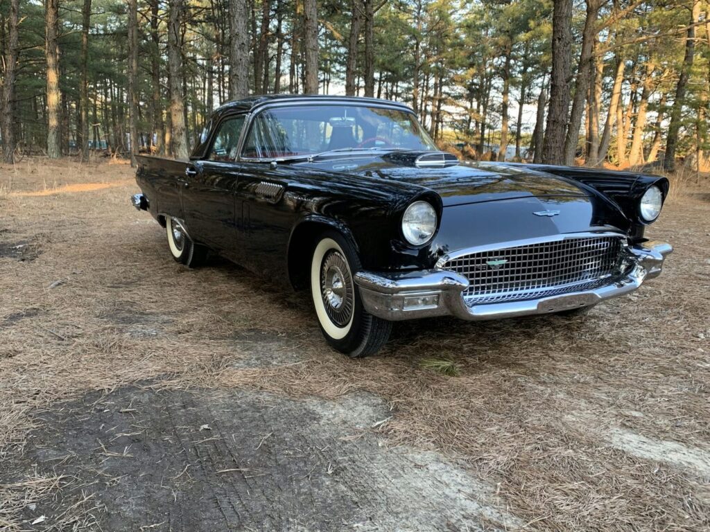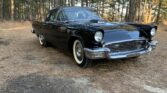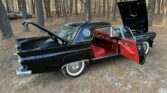 The body was removed from the frame prior to being refinished. The car is finished in black over a red vinyl interior, and power is from a 312ci V8 mated to a three-speed automatic transmission. Additional equipment includes a color-matched removable hardtop, power steering and brakes, fender skirts, a heater/defroster, and a push-button AM radio.