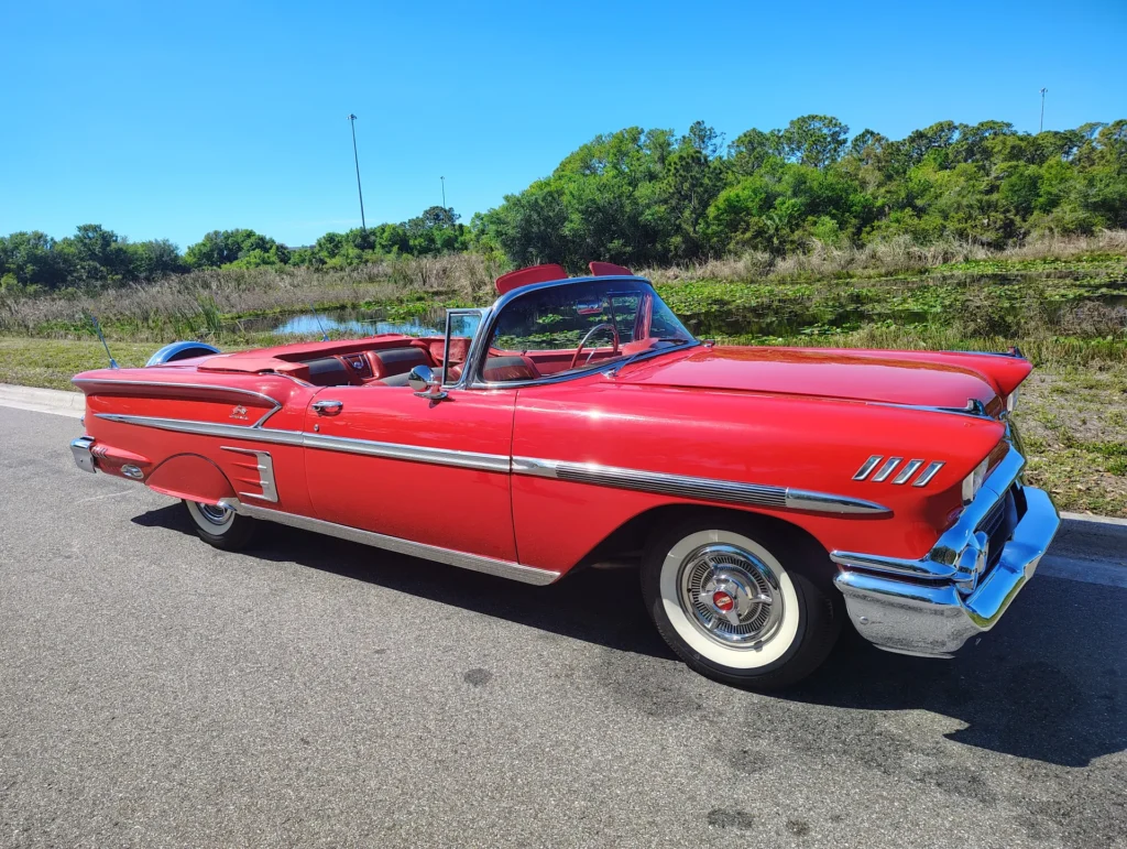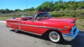 This 1958 Chevrolet Impala Convertible is very well finished. Finished in Rio Red over red vinyl and striped cloth, the car was previously restored and the the work included many correctly date-coded components, including the optional 348 Super Turbo-Thrust engine with 3x2 induction. Factory literature didn't show a four-speed as available until the 1959 model year, but as of February 1958, customers could order a four-speed manual transmission to replace the factory three-speed, although the gearbox had to…