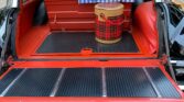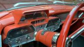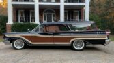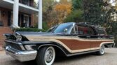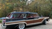 This 1959 Mercury Colony Park station wagon is finished in black over red and powered by a 383ci Marauder V8 paired with a three-speed Merc-O-Matic automatic transmission. Features include faux exterior wood paneling, a chrome roof rack, a curved windshield, a front-facing third-row seat, an electric clock, power windows, power door locks, power steering, power drum brakes, finned quarter panels, and a push-button AM radio.