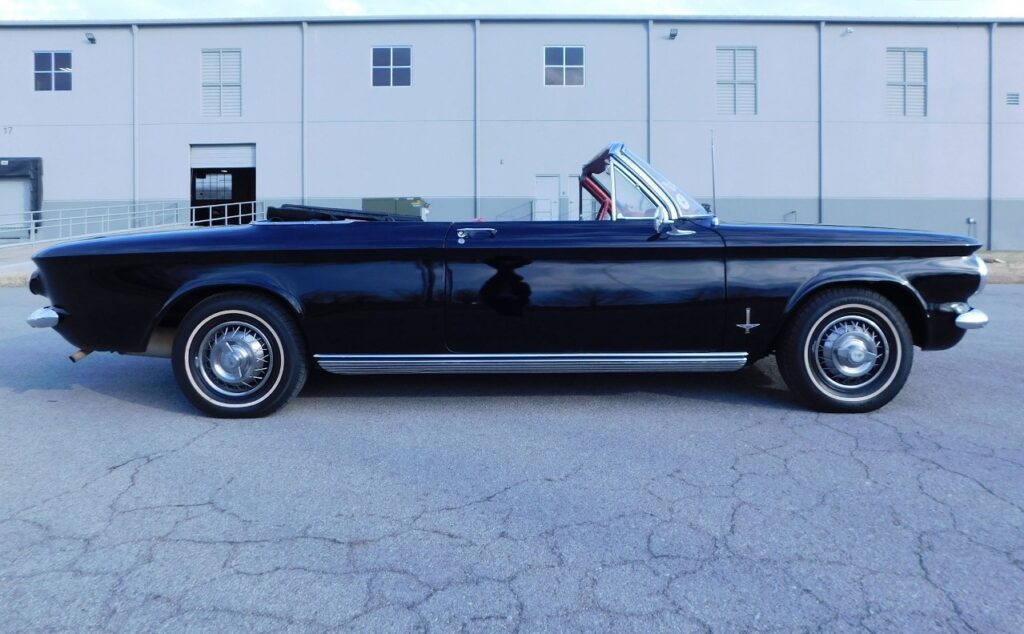 Step into a time capsule with this striking 1964 Chevrolet Corvair Monza Convertible. This classic beauty boasts a sleek black exterior that pairs with its sophisticated black leather interior, creating a timeless aesthetic that is sure to turn heads wherever you go.