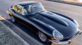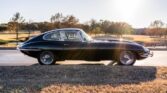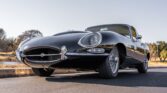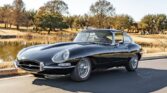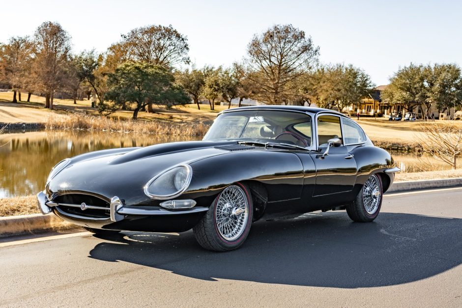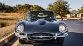 This 1963 Jaguar XKE is a Series I coupe finished in black over taupe leather and powered by a 3.8-liter inline-six paired with a four-speed manual transmission. Features include glass headlight covers, triple SU carburetors, chrome 15″ knock-off wire wheels, and four-wheel disc brakes.