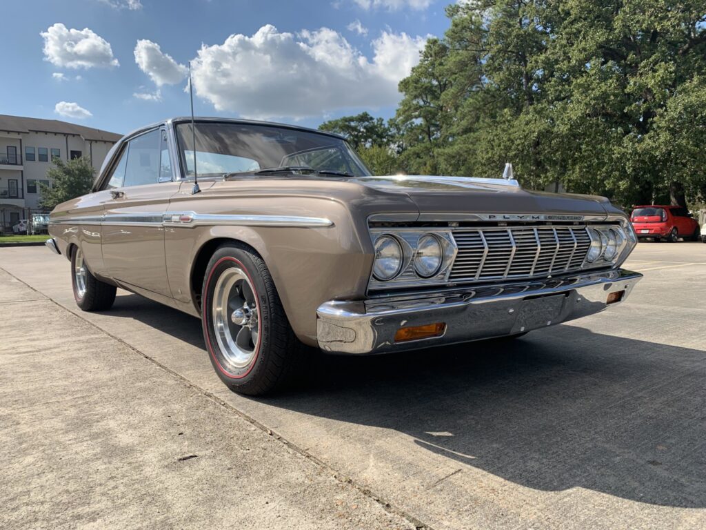 1964 Plymouth Sport Fury. The body was diassembled, acid-dipped and underwent rust repair in the cowl, floors, quarter panels, and trunk followed by a repaint in metallic taupe using PPG Deltron base/clear coat. Bright trim was replated and polished by Speed and Sport Chrome Plating of Houston, Texas, and the weatherstripping is said to have been replaced. Mag wheels with grey spokes and polished lips are mounted with BFGoodrich redline tires. The control arms, ball joints, tie rods, suspension bushings, and shocks have been replaced, and a SSBC power-assisted front disc brake conversion kit with stainless steel lines has been installed. The interior has been refurbished with gold vinyl seat upholstery as well as a replacement package tray, door panels, carpets, sun visors, and armrests. A stock AM radio remains in the dash, and a remote-controlled aftermarket stereo with Bluetooth has been installed in the glovebox. A Gen IV Magnum heating and air conditioning system from Vintage Air has been added, and is operated via a controller in the center console storage bin. The five-digit odometer is said to show approximately 16k miles, with total mileage unknown. The 440ci V8 has reportedly been rebuilt with a .060″ overbore, and features include: Holley four-barrel carburetor on a Weiand intake manifold; Crane camshaft; MSD billet distributor and Digital 6 ignition controller; Griffin aluminum radiator with dual electric fans; M&H wiring harness; Mandrel-bent stainless steel exhaust system with X-pipe and MagnaFlow mufflers.