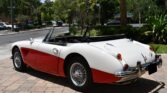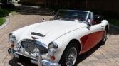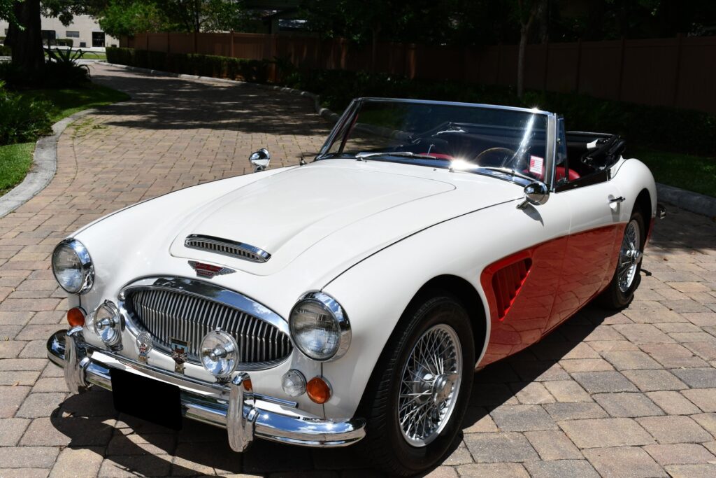 Impressively restored 1965 Austin-Healey 3000 MK III with strong inline-6 and 4-speed manual w/ overdrive. Finished in white and red with stunning red leather interior, excellent chrome, and like-new black convertible top. Features spoke wheels, wood dash, and full-size spare—runs and drives beautifully.