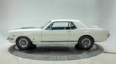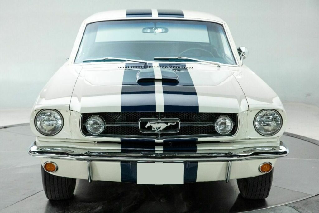 Can you spell K Code? Well here is a 1965 Ford Mustang K code GT Coupe. This fabulous Mustang is powered by the stout Hi Performance 289, 271 hp V-8 Engine with a dealer installed tri-power and a 4 speed transmission. It cruises down the road with ease and performance that attests to its exterior Shelby trim. This fantastic and rare Mustang came out of a collection of truly unique and well turned out Mustangs. Any true Mustang fan knows that the K code and Shelby package is a coveted commodity. Here is one very nicely optioned Mustang coupe ready to enjoy today. This is a no disappointment rendering that is sure to please it s new owner and supply them with years of fun and appreciation. This one features a strong running K code hi perf 289 V8 with tri-power Holley carbs on an aluminum intake with finned aluminum Cobra valve covers, Cobra aluminum oil pan, dual point distributer, and polished finned air cleaner. Correct Easy Shifting 4 speed manual transmission, Front Disc Brakes, rear drums, with a 4:20 open 9 inch rear end gear. There are tuned long tube headers with x pipe aluminized Dual Exhaust with performance mufflers and trumpet exhaust, Fiberglass Shelby style hood scoop with steel hood , and Full Length blue Shelby GT Body Stripes. Finished in Freshly Buffed and Waxed Diamond Gloss Wimbledon White along with an immaculate Blue Bucket Seat Interior, Safety Guard Padded Dash and front and rear seat belts. There are full factory gauges including the 120 MPH speedometer a factory AM radio (in-op) very stylish and desirable Ralley Pak with 8000 RPM Tach and clock gauges mounted on steering column. Driver s side remote Chrome mirror and Day Night Interior rear view mirror. The gorgeous optional Styled Steel Wheels blasts around on newer 14 inch Firestone redline bias ply tires. The engine bay is nicely detailed for show and the trunk comes with a mat. Look at the underside of this beauty. It doesn t stop at the rocker, the underside is finished with lots of detail showing and you can see every seam and weld. The torque boxes are solid as are all the frame rails.