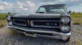 1965 Pontiac GTO Convertible in Starlight Black with red Morrokide vinyl. Powered by a 389ci V8 with 335 HP, two-speed Super Turbine 300 automatic, and Safe-T-Track rear. Features black power soft top, dual exhaust with Magnaflow mufflers, American Racing wheels, front bucket seats, power steering, and power-assisted brakes. Well-documented with PHS records and clean title.