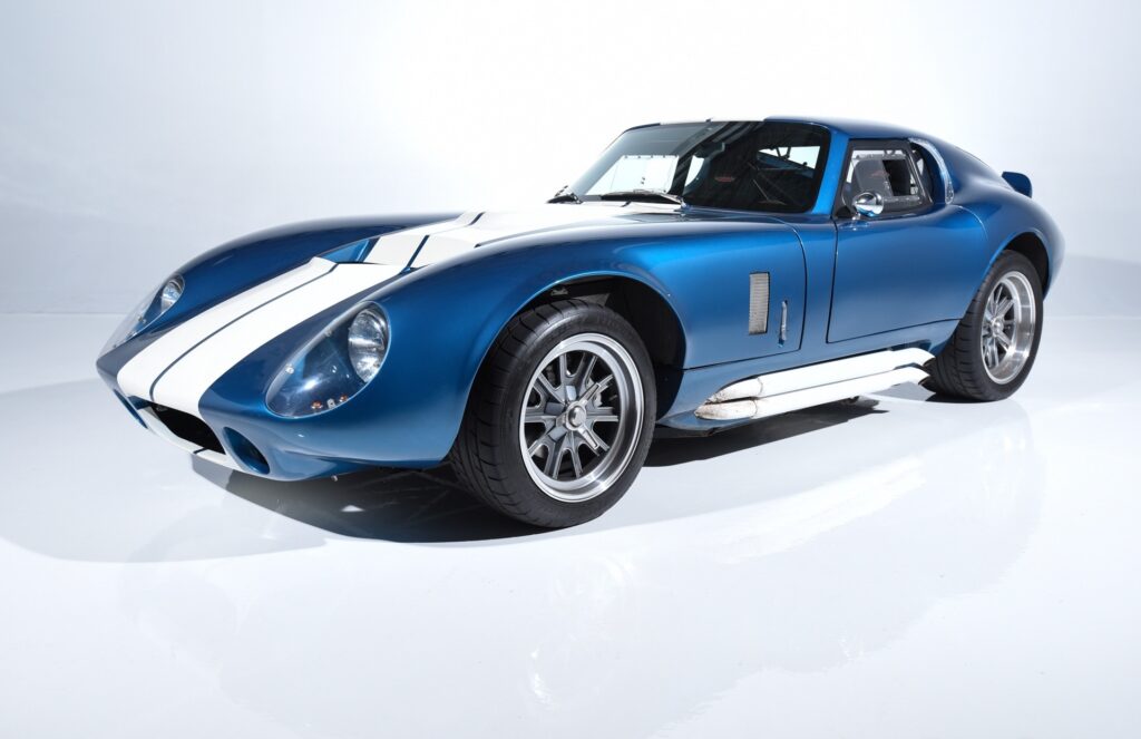 We are pleased to offer this stunning Daytona Factory Five Gen 3 Type 65 Coupe tribute car. Our example is presented in Vintage Race Blue with a white stripe and black interior. The build is in excellent condition with only 3,042 miles and sporting a 5.0L Roadster Coyote Engine. Options include: Gen 3 Coupe Complete kit, A/C, Windshield wipers, Backup camera, EFI fuel system, IRS front/rear sway bars, IRS 11.65 brakes, Wildwood pedals, Gen 3 powder coated chassis,…
