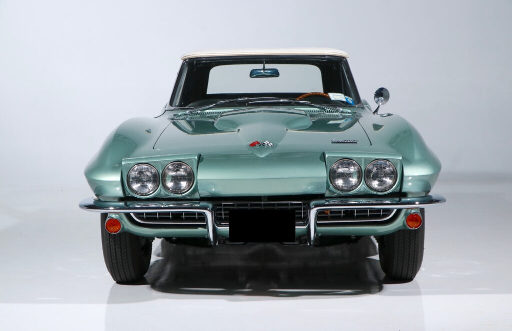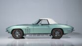 This 1966 Corvette Convertible 427 Roadster features the rare 450 HP V8 engine and a 4-speed manual gearbox. Dressed in desirable Mosport Green with a green vinyl interior, this vehicle underwent an extensive nut and bolt restoration.