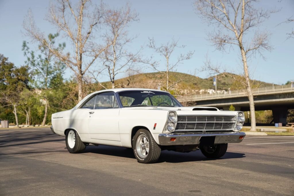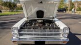 This 1966 Ford Fairlane 500 two-door hardtop is finished in white over black upholstery and is powered by a replacement 427ci V8 paired with a three-speed automatic transmission. The aluminum 427ci V8 was installed in 2016 and features a Lunati camshaft, Edelbrock Performer FE cylinder heads, solid lifters, a midrise intake, and Holley carburetors. An aluminum oil pan and MSD ignition have been installed, and the alternator has been replaced. The oil and filter were recently changed, and the battery has been relocated to the trunk. The cabin features front bucket seats and a rear bench seat upholstered in black vinyl joined by a matching dashboard, carpet, and door panels. Polished 15″ five-spoke American Racing wheels wear 215/60 BFGoodrich tires up front, and white Wheelsmith 15″ steel wheels fitted with 275/50 Mickey Thompson tires are installed out back. Power is sent to the rear wheels through a C6 three-speed automatic transmission. The car is equipped with a 9″ positraction differential with 3.25:1 gears, Flowmaster mufflers with Granatelli electric exhaust cutouts, and ceramic coated headers.