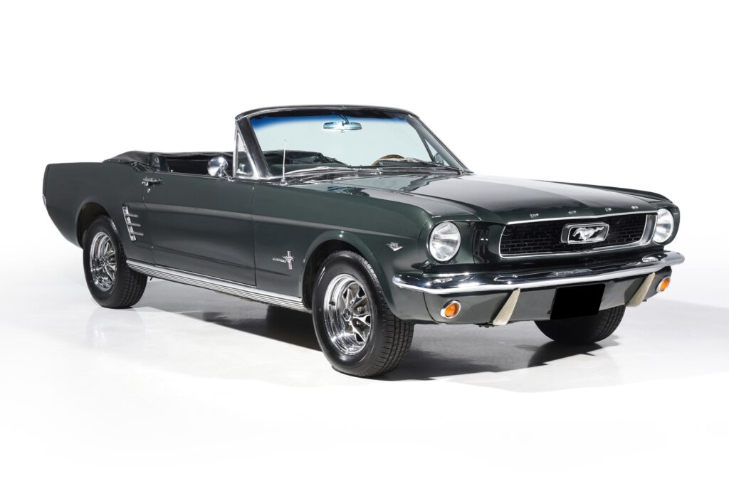 We are pleased to present this beautiful 1966 Ford Mustang convertible featured in gorgeous Dark Ivy Green with beautiful Black interior and matching power convertible top. Power is provided by Ford’s popular 289CI/200HP V8 with C-4 automatic transmission. The car has been restored. This factory C-Code Mustang is equipped with many desired options, including rare air-conditioning, power steering, power front disc brakes, power top, styled steel wheels, wood grain steering wheel, and dual exhaust.