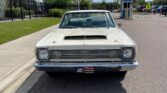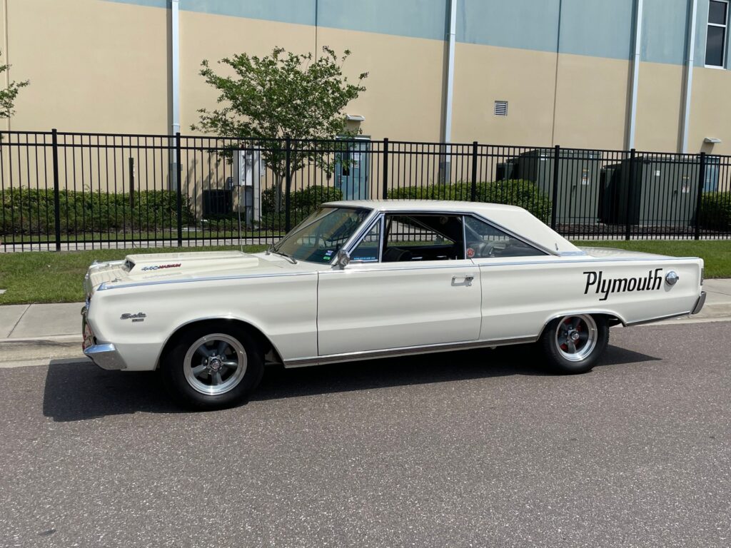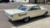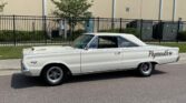 This 1966 Plymouth Satellite was designed to be cheap fun when it was new, and a lot of hot rodders back then raced, in drag race competition and on the street, a big block engine in these cars that was a take-no-prisoners piece with an attitude that made these cars so successful in the glory years of the muscle car era. Today they’re red-hot collector’s items. Ours has had a new powerplant added, a 440 cubic inch dual-quad modified engine, TorqueFlite tranny, and H.D. rear end, plus mag wheels, a hood scoop, and Plymouth callouts on the sides to make this a NHRA Super Stock looking period muscle car. When you lift the hood, you can’t help but notice how period correct, and mean, this engine and compartment looks! It has a rebuilt and much modified 1969 440 cubic-inch Six-Pack V8 engine upgrade that has a lot of go-fast goodies, like the twin dual-quad Edelbrock AVS four-barrel carburetors with twin open air cleaners, an aluminum intake, MSD ignition, long tube headers and 3 ½” dual exhaust with electric cut outs, aluminum finned MOPAR valve covers, cam and kit, power steering and brakes, and performance spark plug wires. The big block V8 feeds a stout Torqueflite A727 three-speed automatic transmission with a shift kit and a 2200 rpm stall converter, and it also has an aluminum water pump, Champion radiator. The front end was rebuilt with disc brakes on the front, KYB shocks, GTX rear springs, and 3:50 gear in the Sure-Grip rear end. It rides on great-looking polished Torque Thrust type 5-spoke wheels and black sidewall tires. The all black twin bucket seat and matching rear seat interior is redone in an original style from Legendary Interiors so that everything from the upholstery to the carpeting feels original and clean. It has a center console, chrome automatic floor shift, black factory steering wheel, great black dash with factory gauges, Autometer accessory gauges, matching door panels and headliner, and pushbutton radio, all make for an ideal way to experience a premium and powerful classic Plymouth. Our Plymouth has the look exactly how you want of a vintage race car inspired Mopar. It has its classic and correct fiberglass scooped MOPAR racing hood, sharp white paint job that shows off this Satellite’s sharp-edged styling, great chrome bumpers, Plymouth call outs on the sides, full-length trim, and ornate grille means this 66 is a cool done classic, right down to the details.