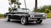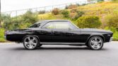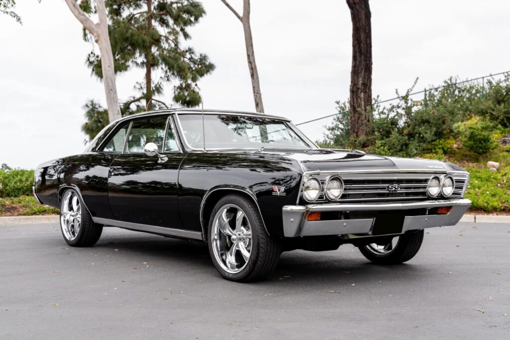 This black 1967 Chevrolet Chevelle SS features a replacement 454ci V8 equipped with high-performance Edelbrock and Holley components. It includes a four-speed manual transmission, 12-bolt Positraction rear axle, and upgraded rear disc brakes. Polished Ridler wheels and power steering round out this well-documented muscle car.