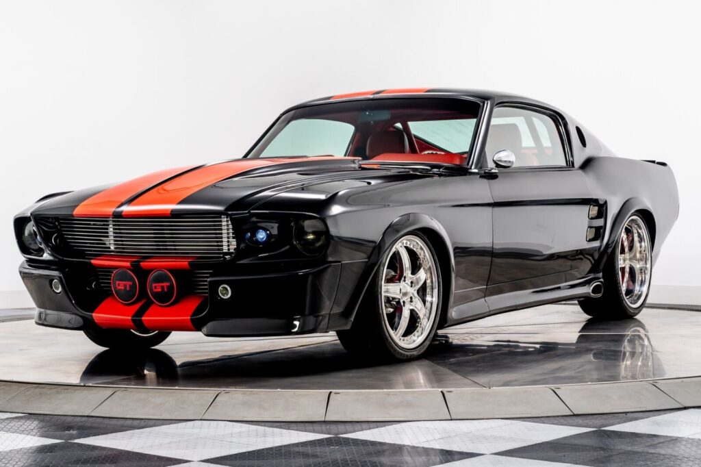We have just added to our extensive exotic car inventory a beautiful 1967 Ford Mustang Fastback Restomod in Raven Black over Red leather interior. This amazing custom Mustang is loaded with: 545ci big block V8, 6 speed manual transmission, Eleanor Shelby body kit, shaved door handles, bright red over-the-top stripes, polished Boze alloy wheels, Wilwood disc brakes, immaculate paint, smoothed and shaved firewall, rose jointed Le Mans and export braces, Pro-Flo fuel injection, Edelbrock Performer RPM heads, Billet…