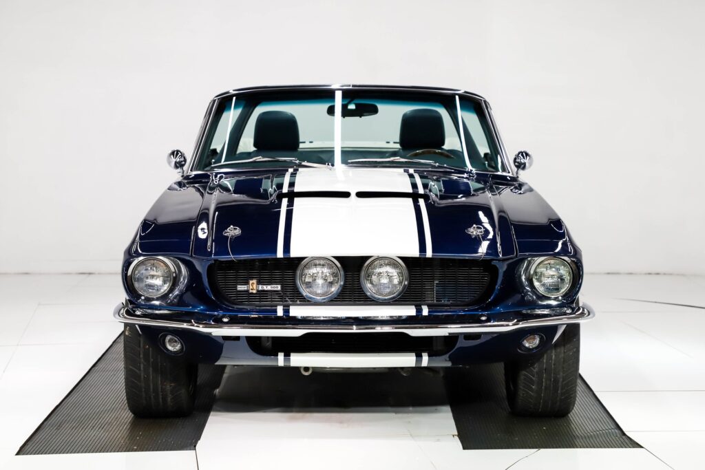 Finished in Indigo Ink Pearl with Super Snake stripes, it features a custom interior, Bluetooth audio, and modern gauges. Upgraded with a Griggs Racing suspension, Baer brakes, and 18” wheels, this Mustang delivers exceptional handling and show-quality craftsmanship.