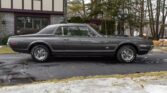 The S-code car is powered by a 390ci V8 paired with a wide-ratio four-speed manual transmission and is finished in metallic gray over Parchment leather. Additional equipment includes power steering, power-assisted front disc brakes, heavy-duty suspension, a functional GT-E-style hood scoop, an XR-7 dashboard, and woodgrain interior trim.