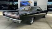 We have a sharp black restored 1968 Plymouth Road Runner that is very original that was a purpose-built muscle car, it was meant to go fast while retaining a spartan look and interior, meaning less weight and frills. It is powered by the Plymouth performance built, what we believe to be, numbers matching 383 cubic inch V8 engine with a four-speed manual transmission shifted by the Hurst shifter. The 383 has a factory stock intake, valve covers, heads, and block, with a four-barrel carb, black 383 Road Runner Air cleaner assembly with the correct decals, factory cast iron exhaust manifolds, dual exhaust, with it sitting in an original looking clean, painted, and detailed engine compartment. The underneath is as clean as the engine compartment and it drives and handles well with plenty of get-up-and-go. The black vinyl factory looking interior has a bench seat, three-spoke Road Runner steering wheel, the original dash and gauge package, 4-speed chrome Hurst shifter with the white cue-ball knob on it, black carpet, matching rear seat, great door panels, Road Runner emblems, and a pushbutton radio system.
