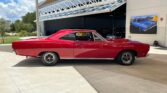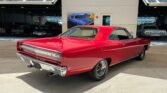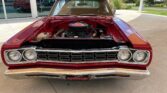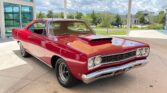 We have a sharp restored red “real” 1968 Plymouth Road Runner that is very original. It was a purpose-built muscle car and meant to go fast while retaining a spartan look and interior, meaning less weight and frills. It is powered by the Plymouth performance built, what we believe to be, numbers matching 383 cubic inch V8 engine with a three-speed automatic transmission on the column. The 383 comes with the factory stock intake, valve covers, heads and block with a four-barrel Edelbrock carb, performance plug wires, Black factory Air cleaner assembly with the correct original decals, long tube headers and dual exhaust, power brakes, and all sitting in a very nice, original, clean, painted, and detailed engine compartment. The 383 cubic inch engine was standard with the 426 Hemi the only option available for the Road Runner until mid-year production. The red/black vinyl factory looking interior has bench seats, matching rear seat and door panels, three-spoke sports Road Runner steering wheel with the Beep-Beep Roadrunner horn, the original gauge package and auxiliary tach and mounted gauges below the dash, red carpet, Road Runner emblems, and a stereo radio system. It has a lot of originality to this interior and it looks as it did back when it was new. The Matador Red paint scheme with the lift-off fiberglass hood and scoop really pops and the muscle car lines look super as well as the front and rear chrome bumpers, glass, trim, and it has the right factory stance too with the raised white letter BF Goodrich Radial Ta’s that it rides on mounted on the black and chrome factory styled steel wheels and chrome lug nuts. It has the famous Road Runner cartoon graphics that Plymouth paid $50,000 to Warner Bros.-Seven Arts to use the Road Runner name and likeness from their Wile E. Coyote and The Road Runner cartoons (as well as a “beep, beep” horn, which Plymouth paid $10,000 to develop) that our car still has.