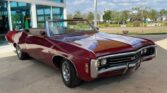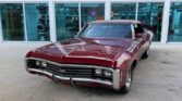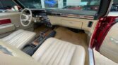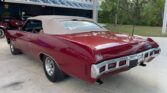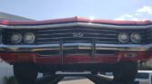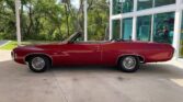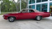 350 cubic inch engine and automatic transmission with the engine block, heads, valve covert, and intake all painted in Chevrolet orange, with a four barrel carb, chrome Edelbrock open element air cleaner, power steering, air conditioning, cast iron factory exhaust manifolds leading back to a dual exhaust system underneath.