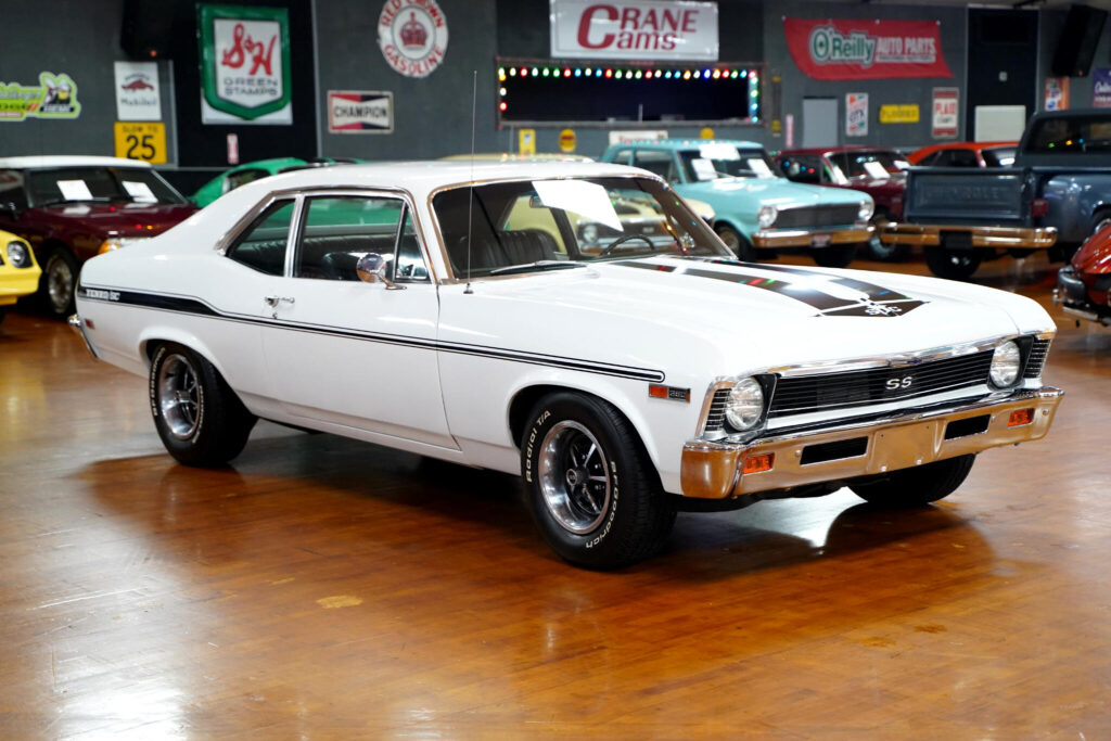 Clean 1969 Chevrolet Nova with 350 V8 and Hurst 4-speed manual. Equipped with Edelbrock intake, Flowmaster dual exhaust, and 10-bolt rear. Features Yenko-style stripes, chrome accents, and black interior with center console. A strong-running, driver-ready classic muscle car.