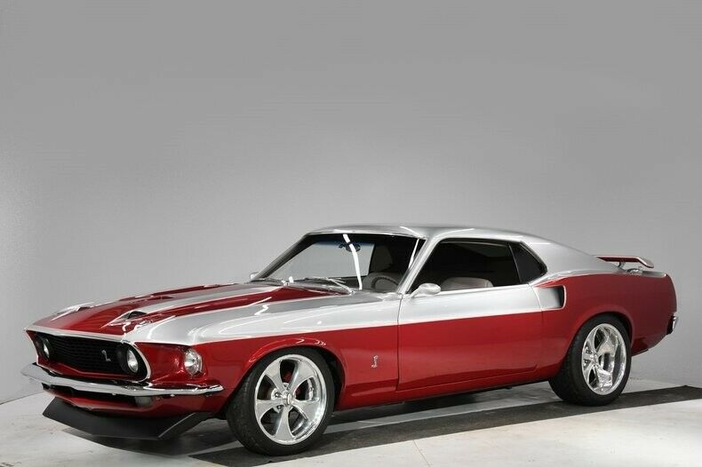 This 1969 Ford Mustang Shelby-inspired restomod is a one-of-a-kind show car featuring custom two-tone Electric Currant Red and Leisure Travel Silver paint with a thin pinstripe and glass-like polish. The body is laser straight, with smoothed fenders, scoops, molded rear quarters, shaved emblems, and remote-operated doors and trunk. The lowered stance on 18-inch Boyd Coddington wheels with wide rear performance tires completes the aggressive look.