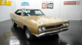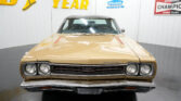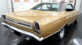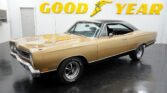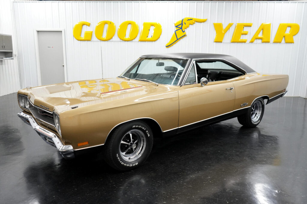 Air Conditioning. Power Brakes. Power Steering. 14 Inch Front Wheels. 15 Inch Rear Wheels. 150mph Speedometer. 3.73 Gear Ratio. 7-Blade Cooling Fan. 727 Torqueflite Automatic Transmission. Automatic Floor Shifter. BFGoodrich Radial TA Tires. Black Carpeting. Black Dash Pad. Black Door Panels. Black Headliner. Black Lower Body Color. Black Vinyl Interior. Black Vinyl Top. Bright Side Mouldings. Center Console. Chrome Front and Rear Bumpers. Correct Color. Dual Exhaust. Edelbrock AVS 2 4 Barrel Carburetor. Factory Tachometer. Front Bucket Seats. Front Drum Brakes. Front Tires: 225/70/14. Hood Mounted Turn Signals. Magnum 500 Chrome Steel Wheels. Mechanical Fuel Pump. Mopar 9 3/4 Inch Dana 60 Rear End. Numbers Matching 440cid Mopar Engine. Original Build Sheet. Real GTX. Rear Tires: 255/60/15. Spanish Gold Metallic Exterior. Stock Cast Intake. Stock Coil. Stock Distributor. Stock Ignition. Stock Radiator. Rear Drum Brakes.