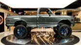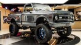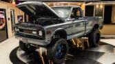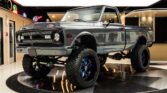 Check out this amazing 1970 GMC 2500 4X4 Pickup Restomod! This GMC has been completely sandblasted, with metalwork and bodywork that show the result of a high-end restoration. After all the body spa treatment, it was professionally sprayed in a Duxone Nimbus Gray and Abyss Gray two-tone paint job with a Matrix clear coat. All the trim is finished in gloss black to break up the two-tone look. This GMC is sporting 24-inch U.S. Mags Forged Sniper wheels custom powder-coated in gloss black and Candy Blue, wrapped in 37-inch Fuel MT tires, After Market LED Headlights! Inside, this ’70 is fitted with custom TMI interior features a bench seat, door panels, After Market Radio and a dash pad that are black with blue stitching. Custom additional features include a CNC Billet Gauge Cluster with Dakota Digital VHX black and blue gauges, a glove box door with Chevrolet script and a 15 – inch Billet Specialties steering wheel with a new Ididit tilt steering column. The interior